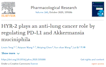 2020年8月21日,国际著名药理学杂志Pharmacological Research在线发表了公司williamhill官网•中西医结合公司毕蕾研究团队最新研究成果:“HYR-2 plays an anti-lung cancer role by regulating PD-L1 and Akkermansia muciniphila”。
