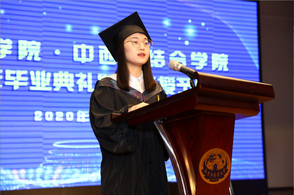 “深深母校情,悠悠学子心”。校优秀毕业生、最具影响力毕业生2015级中西医临床医学专业黄晓燕同学发言,她代表全体毕业生向母校和恩师表达真挚感谢。她围绕“创新”主题,结合中医药在此次疫情的中的表现,讲述了自己对中医药传承与发展的思考。她也代表全体中医学子向母校郑重承诺:以传承中医药为己任,为中医药走向世界做出不懈努力!