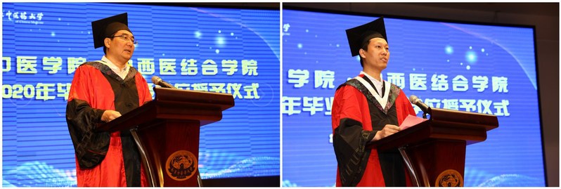 典礼伊始,公司党委书记、分学位委员会副主席倪昊翔老师宣读《关于授予williamhill官网·中西医结合公司2020届毕业生博士、硕士、学士学位的决定》,分学位委员会委员依次为2020届本科生、研究生代表颁发学位证书、拨正流苏。