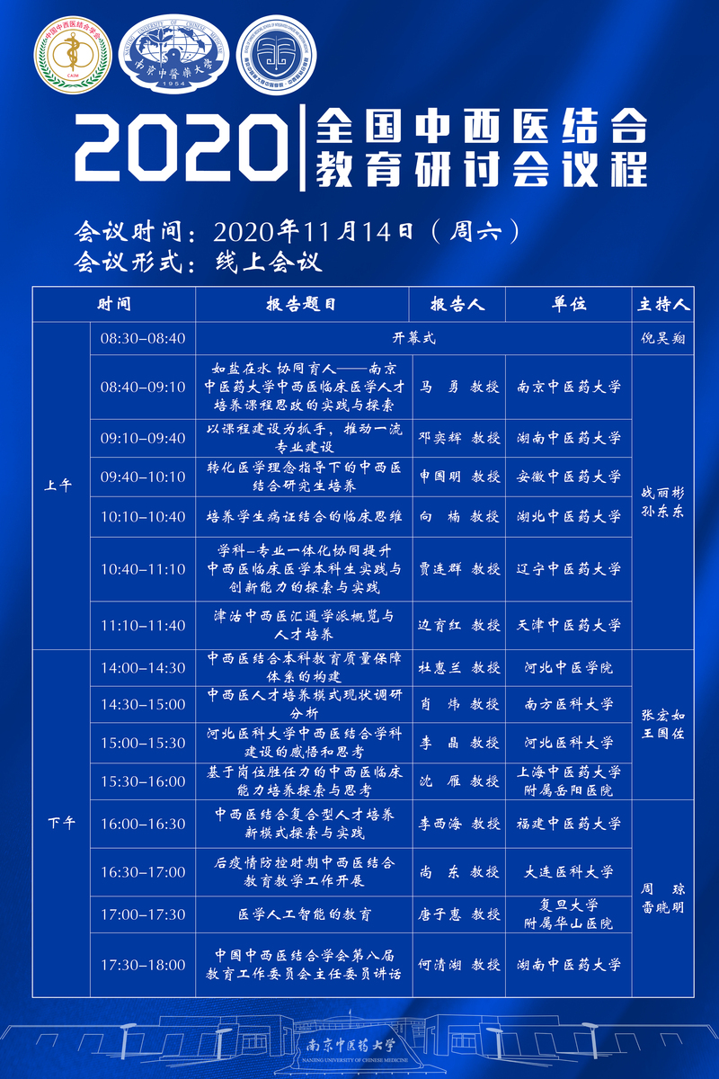 中国中西医结合学会教育工作委员会、williamhill主办,williamhill官网·中西医结合公司承办的“2020年全国中西医结合教育研讨会暨中国中西医结合学会第八届教育工作委员会年会”,将于2020年11月14日召开。本次大会的主题是“坚持以本为本,推进四个回归,加快高水平中西医结合教育改革和团队建设”。