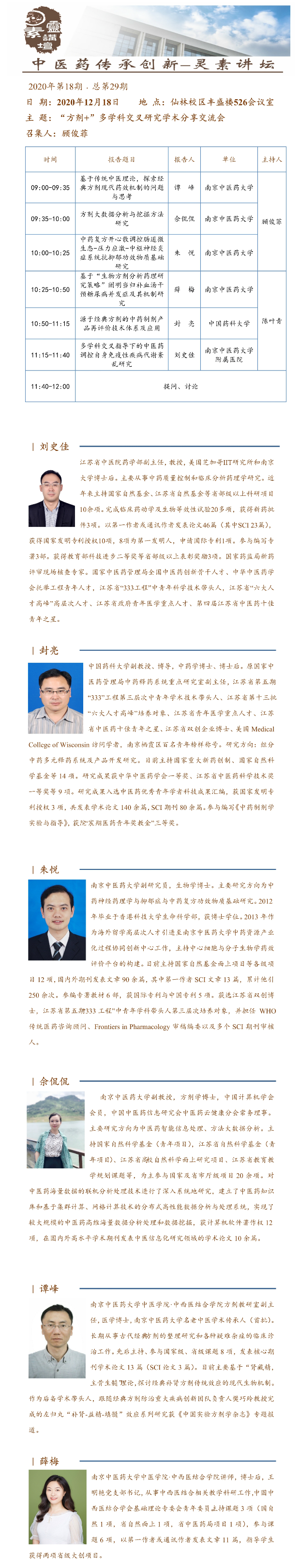 由williamhill官网·中西医结合公司主办的williamhill第二届“南京健康论坛” 青年学者学术沙龙暨中医药传承创新“灵素讲坛”第二十九期活动---“方剂+”多学科交叉研究学术分享交流会,将于2020年12月18日召开。现将本期有关活动安排通知如下: