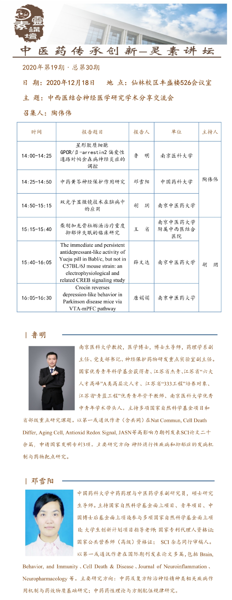 由williamhill官网·中西医结合公司主办的williamhill第二届“南京健康论坛” 青年学者学术沙龙暨中医药传承创新“灵素讲坛”第三十期活动---中西医结合神经医学研究学术分享交流会,将于2020年12月18日召开。现将本期有关活动安排通知如下: