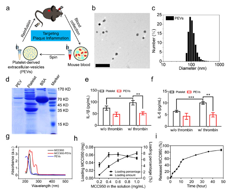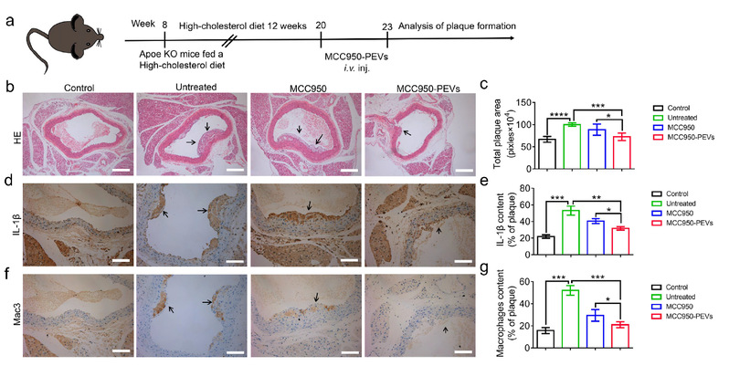 动脉粥样硬化( atherosclerosis)作为一种慢性炎性疾病,其特征在于局部免疫反应的功能障碍。本实验设计了一种由血小板衍生的细胞外囊泡(PEV)以加载NLRP3炎性体抑制剂MCC950,用于动脉粥样硬化靶向治疗。体内活性结果表明,来源于激活血小板的PEV,可以选择性结合多种与体内动脉粥样硬化斑块形成有关的细胞。与对照组比较,静脉给药MCC950-PEV可以显著减少动脉粥样硬化斑块的形成,且可以降低局部炎症反应,同时抑制斑块部位巨噬细胞和T细胞的增殖。动脉粥样硬化是几乎所有获得性动脉疾病的病因。也是心脑血管疾病发病的重要病理过程,其发生的一个重要因素是它具有复杂的炎症过程。相关研究亦表明,动脉粥样硬化与肿瘤的发病过程有着类似的危险因素、病因病机及病理过程,临床治法用药实践也表明2种疾病的治疗可相互借鉴、实现异病同治。本研究提供的药物递送策略将为肿瘤以及炎性相关疾病的中西医结合防治提供新策略、新参考。