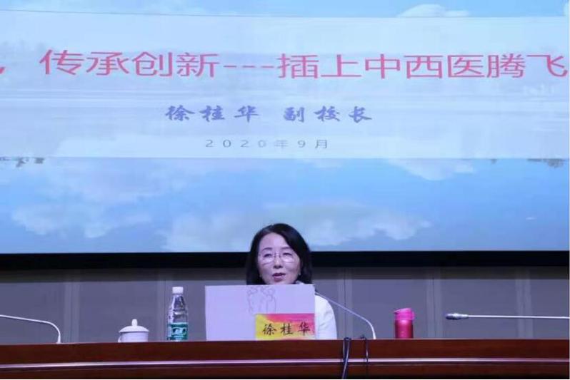 徐桂华教授围绕历史与传承、创新与发展,向新同学们介绍了南中医创校以来,在各个历史时期不断发展前行的光辉历程,介绍了中医药在抗击新冠疫情方面的突出成效以及南中医人在抗疫战争中的杰出贡献。同时也介绍了我们公司强大的团队力量与深厚的历史底蕴。她还通过几位杰出员工的成长经历向同学们阐明了南中医在国家发展战略中的重要担当,引导同学们培育爱校情怀,坚定中医信心,肩负青年使命。