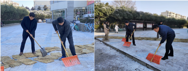 小队成员分工有序,默契配合,手持铁掀、扫帚等工具,破冰、铲雪、扫雪、抛洒工业盐一气呵成,即使身上溅满了冰渣,鞋底被雪水沁湿,大家也没有丝毫停歇,只为争分夺秒地为师生们开通安全出行的道路。