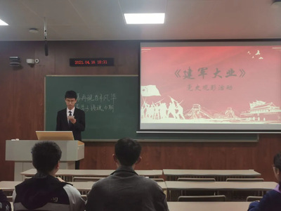 在电影放映前,主持人王鹏程为同学们介绍有关《建军大业》的社会背景。此电影是以革命战争年代,由于党中央早期的右倾主义错误和国民党的叛变,共产党人陷入水深火热之中的史实为背景创作的。