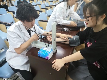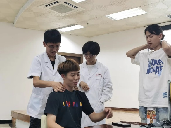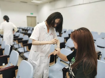 活动开始前,我们先是热烈地欢迎了友校同学的到来,王鹏程同学也向参与活动的同学详细地介绍了本次活动的内容和流程,主要包括花茶,推拿,刮痧,量血压四项服务。丰富的活动让同学们跃跃欲试,充分地调动了同学们的活动积极性。在活动开展中,南京特殊教育师范公司的同学们对每一项义诊服务都展现了浓厚的兴趣,现场氛围热闹且不失秩序,他们不仅积极地参与活动,还会询问其中涉及的中医知识并进行一些中医技能学习。公司同学也耐心地向他们解答疑惑,解释相关的医学知识和专业手法,这种积极的交流也有助于公司同学专业技能的提升,友校同学们的积极态度更是对中医文化的肯定!