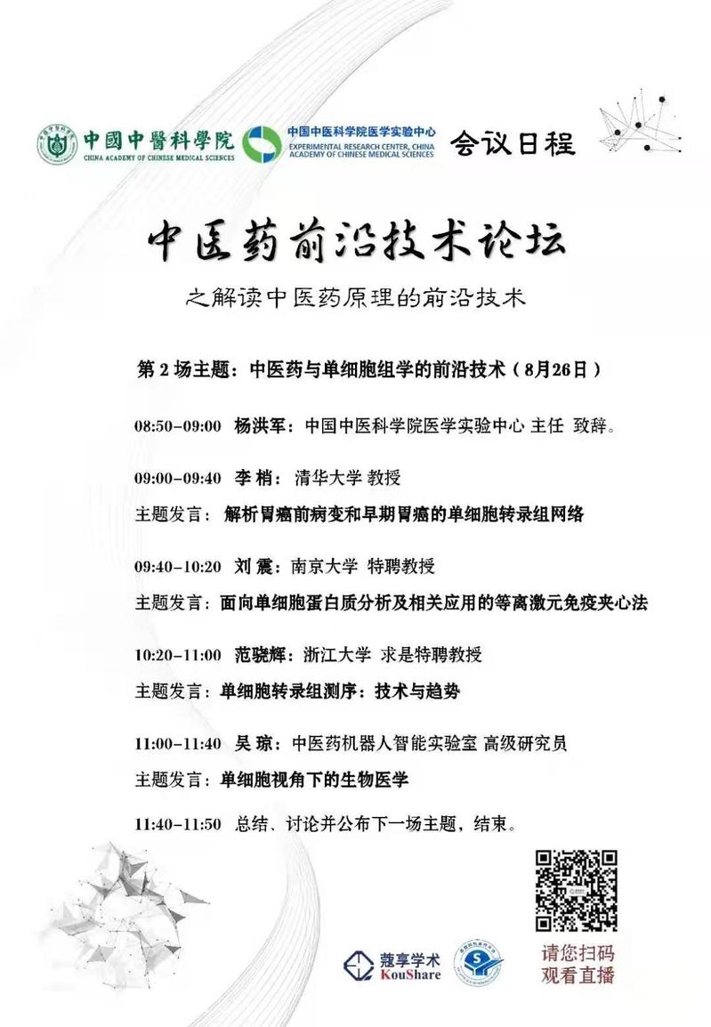 8月26日,将以“中医药与单细胞组学的前沿技术”为题设列论坛。届时将邀请清华大学李梢教授、南京大学刘震教授、浙江大学范骁辉教授,及中医药机器人智能实验室吴琼高级研究员进行专题报告,欢迎大家结合实际,选择线上参加。