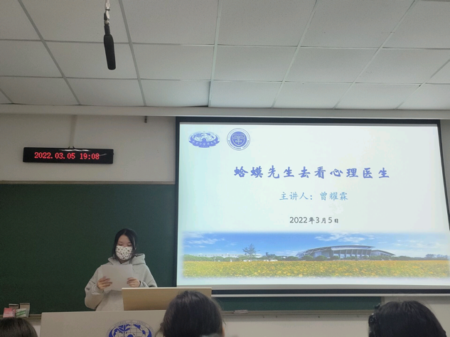曾耀霖同学向我们分享了《蛤蟆先生去看心理医生》,本书作者也提到这不只是写给孩子看的书,这本书作为很有深度的心理疗愈读物,也给了曾同学治愈和感触。曾同学通过书中故事和列举的各种不幸的原生家庭的人群提出了我们应该在艰难环境下始终保持积极向上的心态面对生活,这份治愈的力量也感染到现场的各位同学。