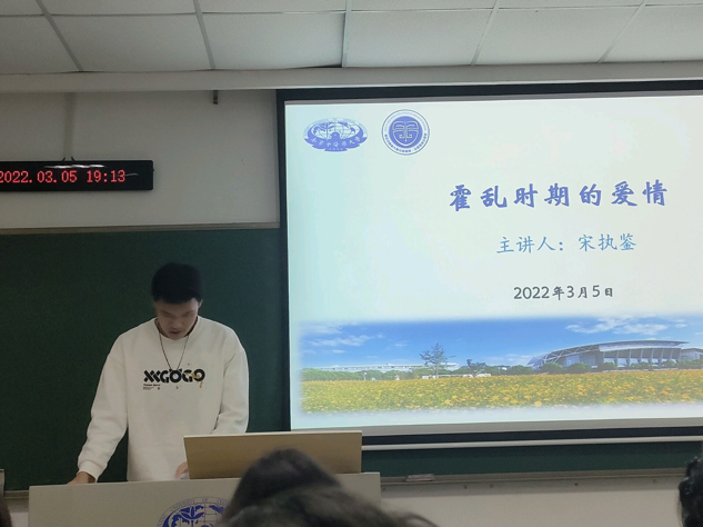 最后,宋执鉴同学简述了《霍乱时期的爱情》里的曲折故事,在霍乱的时代背景下的爱情终究是以悲剧收场。宋同学提出关于爱情的看法:爱情岂是天生天长的无暇美玉,而大概率应是饱经沧桑和磨砺的金石。我们终将在别人的感悟和亲身的体会中更深入对爱情的理解。