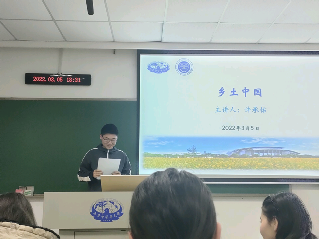 首先,许承佑同学从《乡土中国》说起,通过乡土大体格局和与城市的横向对比由小及大的反映中国的时代变化与革新。期间,许同学抛出一个问题:我们是否能记得邻里的姓名?大部分同学都给予了否定的回答,于是,许同学向我们分享了他记忆里的邻居。最后他提到,“从乡土讲中国,不可谓之不妙”,调动了同学们对以小见大、见微知著的思考。