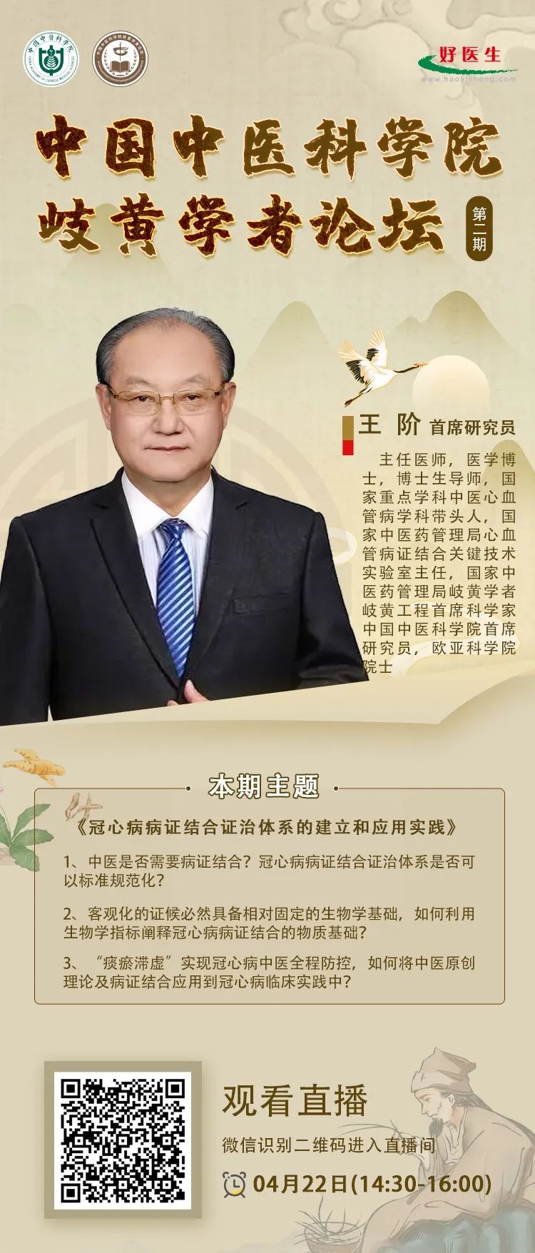 为更好地开展中国中医科公司学术交流活动,搭建高层次学术交流平台,促进中医药学术发展,中国中医科公司2022年举办岐黄学者论坛。2022年4月22日(周五)下午2点30分,特邀国家中医药管理局岐黄学者、岐黄工程首席科学家,中国中医科公司首席研究员王阶以“冠心病病证结合证治体系的建立和应用实践”为题做论坛演讲。