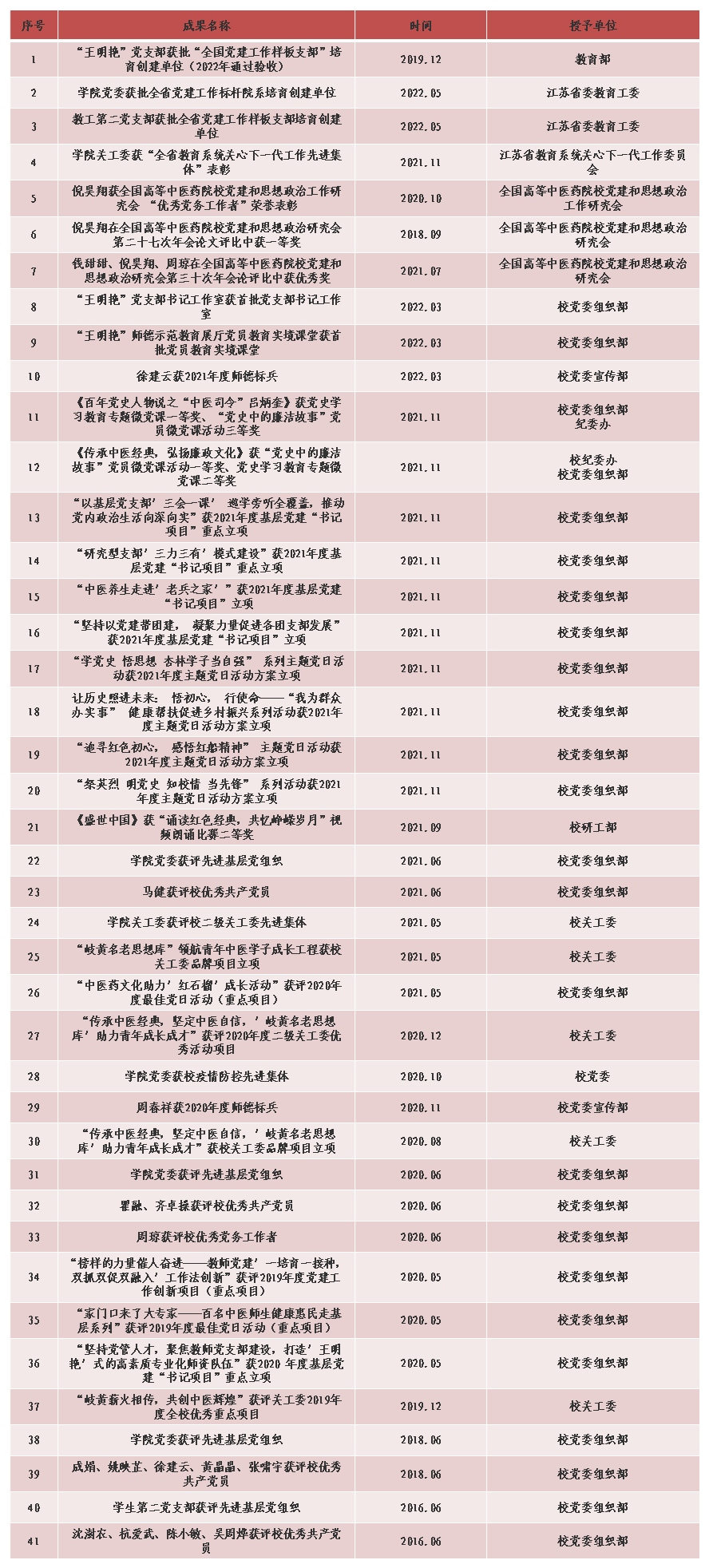 落实全面从严治党要求,以高质量党建引领事业发展。“王明艳”党支部被评为教育部全国党建工作样板支部,教工第二党支部被评为江苏省首批党建工作样板支部。公司党委获评江苏省首批党建工作标杆院系、江苏省教育系统关心下一代工作先进集体、校先进基层党组织、公司党建工作标杆院系等表彰。公司多次获得校基层党建“书记项目”、党建工作创新项目、最佳党日活动和校关工委项目等重点立项。党员师生获全国高等中医药院校“优秀党务工作者”、全国中医药院校优秀辅导员、省“优秀员工干部”、省“三好员工”等荣誉称号。