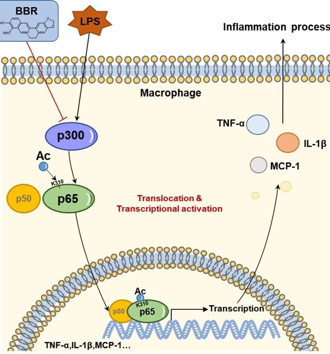 中药黄连活性成分小檗碱在临床上被广泛用于治疗炎症相关性疾病,然而小檗碱的临床抗炎原理一直没有得到明确的阐释。该研究通过蛋白质组学及表观遗传学分析技术,首次发现小檗碱改变LPS诱导的巨噬细胞蛋白质乙酰化。通过体内外模型研究发现,小檗碱主要通过减少NF-κB亚单位p65在赖氨酸310位点(p65Lys310)的乙酰化,导致NF-κB转位和转录活性受到抑制,从而抑制炎症因子的表达。进一步研究发现,小檗碱抑制p300在巨噬细胞中的表达,从而抑制p65Lys310的乙酰化,并在急性炎症和慢性炎症肥胖小鼠模型中加以验证。该研究系统地阐明小檗碱通过直接抑制p300/p65Lys310轴发挥抗炎作用的新分子机制,为小檗碱后续的临床炎症相关的疾病治疗机制和临床应用提供重要药理学依据。