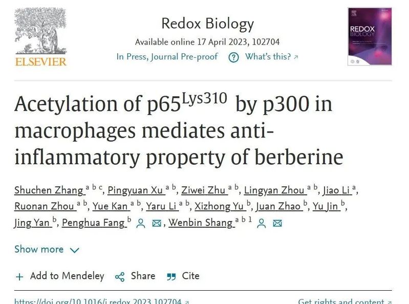 近日,公司青年教师张舒晨老师以第一作者在国际知名学术期刊Redox Biology(中科院生物学一区,IF: 10.787)上发表中药黄连活性成分小檗碱抗炎作用机制方面的最新研究成果:“Acetylation of p65Lys310 by p300 in macrophages mediates anti-inflammatory property of berberine”。