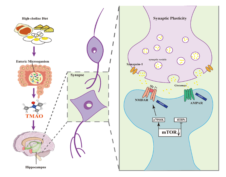 认知障碍是介于“健康”和“痴呆”之间的一种中间状态,会影响记忆和认知功能。其中,高胆碱饮食对认知功能优劣的影响机制研究当前仍然存在空白。该研究证实了胆碱代谢物TMAO可以导致长期和短期记忆缺陷。其机制可能为饮食产生的TMAO 大量聚集,并激活mTOR信号通路所导致海马脑区中CA1和CA3的神经元的大量损失与突触结构的紊乱。该研究成果为过量摄入胆碱对突触可塑性与认知功能的影响提供了重要的新见解。