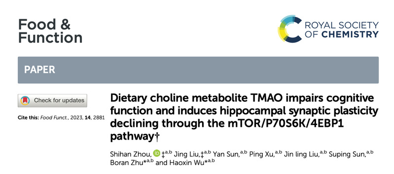 近日,公司吴颢昕教授团队在中科院农林一区TOP期刊《Food & Function》上发表关于膳食胆碱小分子代谢物氧化三甲胺(TMAO)对认知障碍中海马突触结构可塑性损害的机制研究成果(DOI: 10.1039/d2fo03874a)。