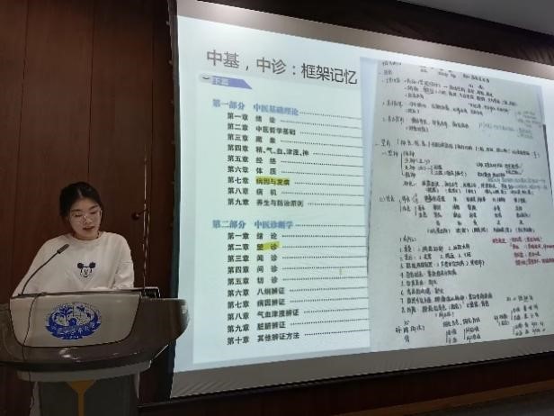 首先,张超玥同学倾情分享了她的学习技巧,“对于《中医诊断学》、《中医基础理论》,我们要善于利用框架帮助记忆”。张超玥同学展示的PPT上那密密麻麻的笔记让同学们深刻的理解了何为“不积跬步无以至千里”,考研的路上最重要的还是刻苦的学习。
