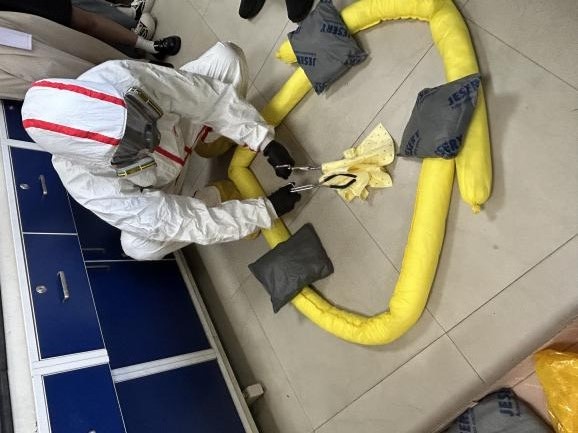 为切实增强师生实验室危险化学品泄漏事故应急处置能力,树牢安全红线意识,营造“人人讲安全、个个会应急”的安全氛围,2023年6月9日上午9:30,由公司和国有资产与实验室管理处联合举办的“实验室有机废液和危化品泄漏应急演练”在B10-201室开展,各公司安全管理员、实验室(中心)安全员以及师生代表50余人到场参与培训并观摩演练。