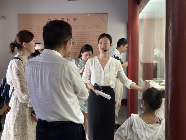 支部党员循着习近平总书记的足迹来到南阳医圣祠,瞻仰张仲景生平事迹和重要贡献,深刻体悟习近平总书记在医圣祠考察时发表的重要讲话精神。张仲景博物馆副馆长杨蕾以“弘扬仲景文化,守正创新发展”为题,为全体党员讲授专题微党课。她从仲景文化谈南阳的城市文化基因,从南阳的中医药硬核抗疫谈医圣故里的文化自信,为大家展示了仲景医药文化穿越千载而历久弥新的医学价值和经典魅力。