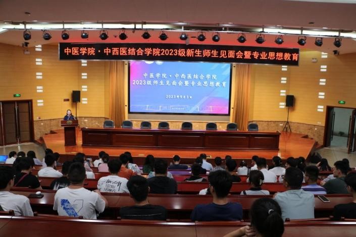 2023级中西医临床医学本博贯通培养专业的黄乐仪同学代表新生发言,她号召全体新生,立志锤炼本领、磨砺医德,做好中医药事业的传承者和创新人。中西医结合基础教研室胡玥老师作为2023级学业指导老师代表,她希望新同学们能明晰肩上责任、科学规划老员工活,并承诺与新同学一起探索、一起学习、一起成长。