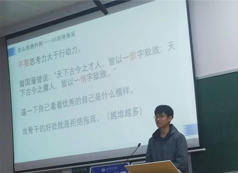 首先,王鹏程学长以“别想太多,人生就一次”为题,就大学阶段面临的各种问题,引导同学们告别内耗,学会取舍,结合切身实际,引导同学们“心宽则天地广阔,心窄则寸步难行”。