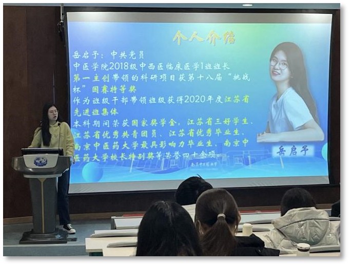 最后,“挑战杯”老员工课外学术科技作品竞赛国赛特等奖获得者岳启予学姐,从“挑战杯”入门准备、备战、答辩等环节作心得分享,引导同学们努力且坚持,平衡课业与时间,扎实基本功,在备战的同时不忘体察民情现实、实践扎根社会,做有多元视野的中医人,为中医药事业添砖加瓦。