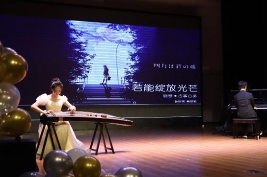 红色娘子军,扛枪为人民。一曲《红色娘子军》选段勾勒出那个特殊年代动人心魄的历史往事,峥嵘岁月,红色经典,优美旋律,震荡灵魂。中国传统乐器演绎典故《精卫》,赋予了故事新的生命,讴歌不畏艰苦、锲而不舍的精神。若黑暗中有光芒,就能化作星空,即使前路永夜,也有星光微弱照亮前途。臧思源与孙安琪同学一曲《若能绽放光芒》合奏,钢琴与古筝的碰撞展现出别样的灵动。