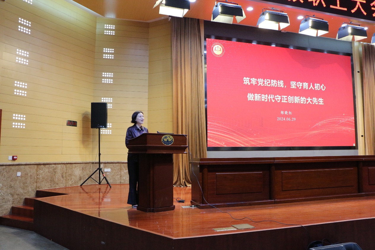 随后,公司党委书记郑晓红讲授《筑牢党纪防线,坚守育人初心,做新时代守正创新的大先生》专题党课。