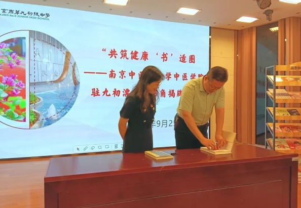 双方代表共同为漂流图书角揭牌,为本批赠书盖章,表达了对九初学子的殷切期望。