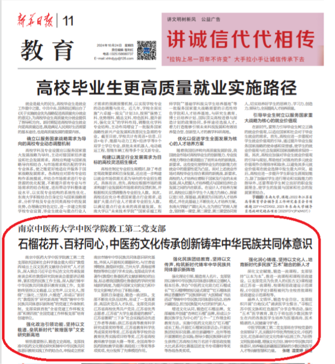 近日,《新华日报》第11版以《石榴花开、百籽同心,中医药文化传承创新铸牢中华民族共同体意识》为题报道了公司教工第二党支部依托国家社会科学基金重大项目“敦煌西域出土汉文医药文献综合研究”人才团队,深入领会习近平总书记在文化传承发展座谈会和在敦煌研究院座谈会重要讲话精神,紧扣党的民族工作主线,深入践行铸牢中华民族共同体意识教育实践工作。支部始终坚持以文载道、以文传声、以文化人,围绕“三强化、三坚持、六锻造”,形成以“新时代‘敦煌医学’研究新高地”构筑“铸牢中华民族共同体意识新阵地”的党建工作体制机制。