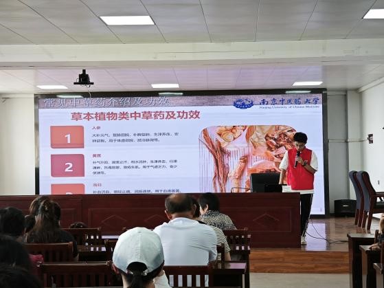 随后,同学们进行中医药文化宣讲,同学们用通俗易懂的语言向在场的居民朋友们介绍了中医药文化的特点、学科基础与其深厚的历史渊源,并展示了“雄黄”、“人参八珍膏”等药品。针对社区中老年居民偏多的实际情况,孙兆东同学着重介绍了中医药养生保健方法这一版块,通过讲解“四季养生之本”、“养生食谱小推荐”、“太极拳”“八段锦”等内容,向在场的居民朋友们展示了中医药文化的魅力。宣讲环节结束后,团队内的同学们还意外收到了在场老奶奶的“现场问病”。
