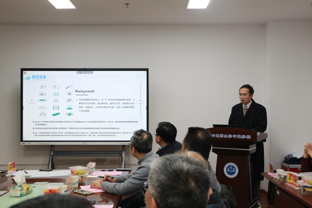 课题负责人郑晓红教授首先对课题研究主旨进行了概述,点明要立足中医经典疫病理论,在全面贯通、挖掘内经学、伤寒学、温病/疫病学的学术思想的基础上,利用多学科交叉的研究思路与方法,阐释五运六气的现代内涵,形成快速响应环境变化与可即时决策的中医疫病预测预警模型。接下来由唐心浩博士进行了详细的课题汇报,他从课题的研究背景、研究基础、研究目标、研究内容、研究方法及进度安排六个方面进行了阐释。