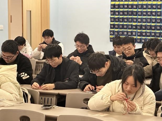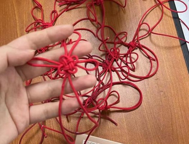 同学们准备好红绳等材料后开始制作,先取一根红绳,将其对折,形成一个圈。接着,让绳头从这个圈中穿过,拉紧,这是最基本的结。然后可以根据想要的造型,不断重复类似步骤。如制作盘长结,就需要多次交叉、穿梭绳子。过程中要注意绳子的走向和拉紧的力度,不然形状会不规整。经过耐心编织,一个小巧精致的中国结就诞生了。团支部准备了精美国风明信片、书签、本子等,很好地调动了大家的积极性,同学们纷纷带着做好的中国结上台兑换奖品。有不少同学主动将中国结留下用于后期赠送社区儿童,传递美好祝福。