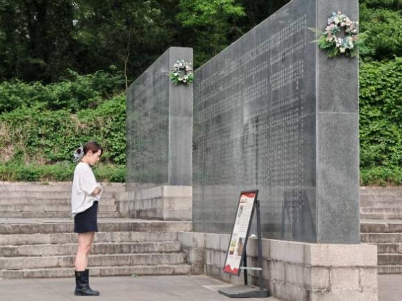 在抗日航空烈士纪念碑前,大家驻足良久。纪念碑如两个巨大的飞机机翼拔地而起,直插蓝天,象征着航空烈士们驾驭着飞机捍卫着祖国蓝天,碑座底部的四组浮雕,生动再现了航空先烈们鏖战长空,保卫祖国的悲壮惨烈场面。而主碑后面弧形排列着的30 座黑色英烈碑,则镌刻着4296 名抗日战争中英勇牺牲的中、美、苏、韩等国航空烈士的英名、生卒年月等,每一个名字都承载着一段英勇无畏的历史,每一行文字都诉说着一段壮烈豪迈的故事。
