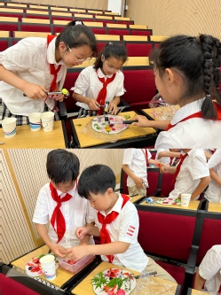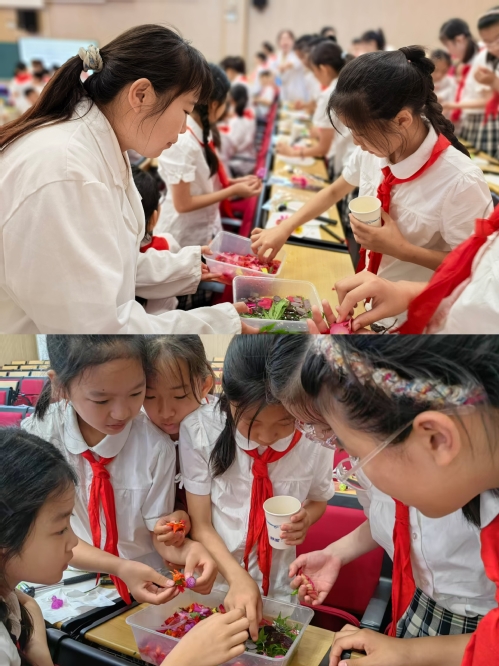中药学教研室周明老师以“花茶”为主题,以金银花、菊花、合欢花等六味常见中草药为切入点,通过趣味问答、实物展示等形式,向小员工们生动讲解药材特性。并通过现场煮茶、品茶的方式,展示了清润利咽茶、养肝明目茶、悦颜安神茶的制作过程。小茶客们在辨尝茶饮中,不知不觉地把金银花、玫瑰花、甘草等草药的知识都装进了小脑袋里,收获了宝贵的中医药启蒙知识。