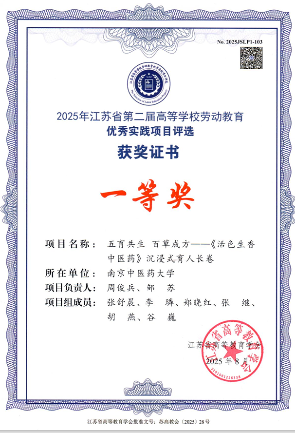 在2025年江苏省第二届高等公司劳动教育优秀实践项目评选中,公司周俊兵副教授与马克思主义・医学人文公司邹苏副教授领衔的团队,凭借《五育共生百草成方——〈活色生香中医药〉沉浸式育人长卷》项目,从全省众多申报项目中脱颖而出,荣获一等奖。这份荣誉不仅是对项目创新性与实效性的高度认可,更彰显了团队教师“以劳育人、以德育心”的深厚师德。